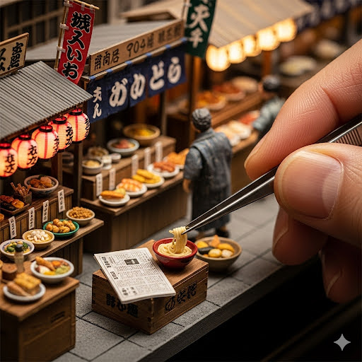 Сейчас он заканчивает свой главный проект — миниатюрную сцену из токийского рынка 1930-х годов. Я подхожу ближе. Я вижу крошечную мисочку с лапшой, в которой каждая лапшинка слеплена вручную. На столе лежит миниатюрная газета с крошечными иероглифами.