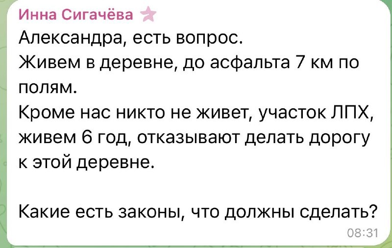 ⚖ Что говорит закон 1. ФЗ № 131-ФЗ «Об общих принципах организации местного самоуправления» Ст. 14 закрепляет обязанность органов местного самоуправления решать вопросы дорожного хозяйства и транспортной доступности в границах населённых пунктов. 2. ФЗ № 257-ФЗ «Об автомобильных дорогах» Ст. 6 и ст. 17 говорят, что автомобильные дороги общего пользования должны обеспечивать подъезд к населенным пунктам. 3. Градостроительный кодекс РФ В генпланах и ПЗЗ поселений обязательно должны быть предусмотрены дороги к существующим населённым пунктам. ⸻ 📌 Нюанс: статус деревни • Если ваша деревня официально существует (есть в ЕГРН, в генплане, не снята с учёта), то администрация обязана предусмотреть дорогу и включить её в планы ремонта/строительства. • Если это фактически отдельный участок ЛПХ «в поле» без действующего населённого пункта — тогда власти могут отказывать, так как обязанности тянуть дорогу к единичному участку у них нет. ⸻ 🚀 Что можно делать 1️⃣ Проверить документы Откройте г