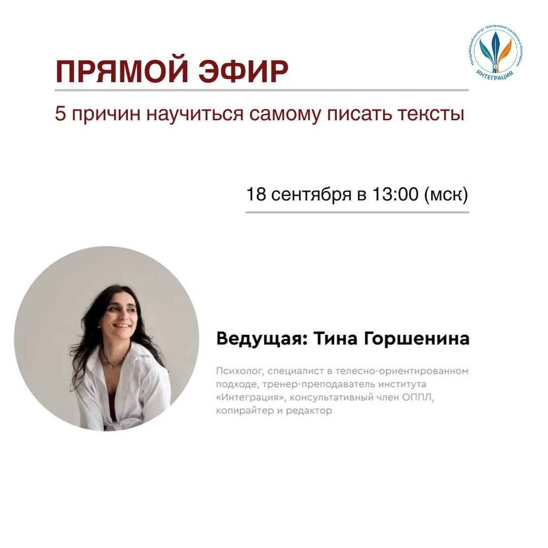 Тексты в профессии психолога не ограничиваются написанием постов в соцсети. Мы выступаем, создаем научные проекты, общаемся с клиентами. Для всего этого важно уметь формулировать слова в грамотный текст. Доносить смыслы, без лишней воды и заезженных штампов. Рассказывать интересные истории и подбирать понятные метафоры. А что еще дает нам навык написания авторских текстов обсудим 18 сентября в 13.00 в прямом эфире «5 причин научиться самому писать тексты». На эфире разберем: 🔹чем авторские тексты отличаются от просто хороших 🔹как найти свой стиль 🔹как навык рассказывать истории помогает в профессии, и как научиться писать интересные истории 🔹 и конечно, разберем 5 причин научиться самому писать тексты😉 Ведущая: Тина Горшенина — психолог, специалист в телесно-ориентированном подходе, действительный член ОППЛ, тренер-преподаватель института «Интеграция», копирайтер и редактор. 👉Эфир пройдет в сообществе института «Интеграция».