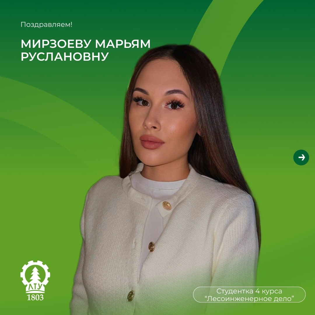 Поздравляем студентку 4 курса направления «Лесоинженерное дело» Санкт-Петербургского государственного лесотехнического университета имени С. М. Кирова Мирзоеву Марьям Руслановну с победой в конкурсе грантов для студентов и аспирантов Санкт-Петербурга!