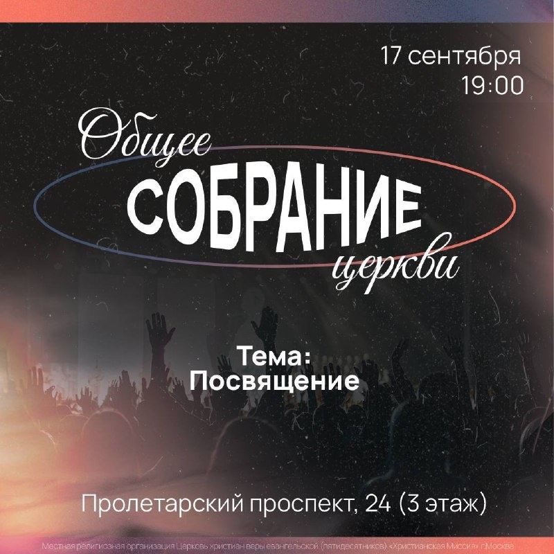 Дорогая церковь! Приглашаем вас на общее собрание церкви 🙌 17 сентября / 19:00 / Пролетарский проспект, 24 (3 этаж) Тема собрания: «Посвящение» Посвящение – это шаг веры, когда мы отдаём Богу не только слова, но и всю жизнь. Это решение позволить Христу быть центром во всём и жить для Него, а не для себя. В посвящении мы находим силу, обновление и настоящее единство с Господом. «Со Христом я распят; и уже не я живу, но живёт во мне Христос. А что ныне живу во плоти, то живу верою в Сына Божия, возлюбившего меня и предавшего Себя за меня.» (Галатам 2:20) До встречи!