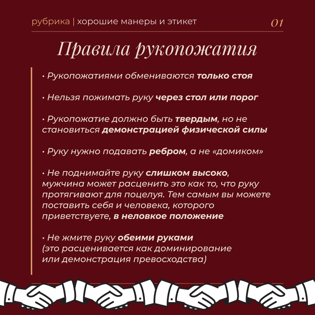 Основные правила рукопожатия Не так давно я вам рассказывала об истории рукопожатия, его особенности в разных культурах и разных эпохах. Теперь поговорим уже подробно о том, как правильно жать руку 🤝 💬 Пишите в комментариях, придерживаетесь ли вы данных правил? Или может есть правило, которое нарушаете чаще всего? #хорошиеманеры