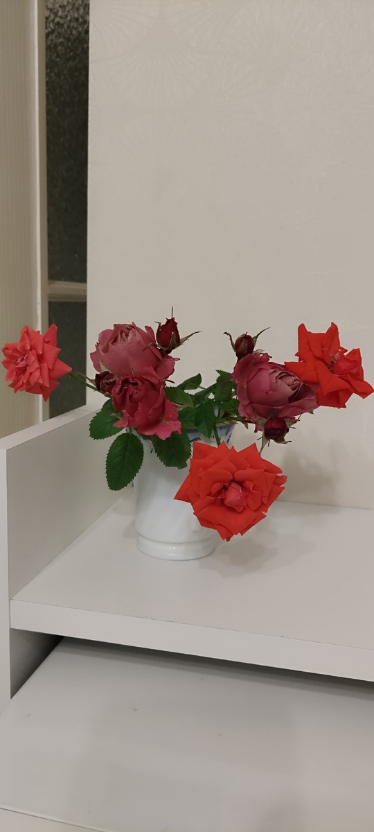 С марта в нашем доме не прекращая цветут розы. Я срезаю их и ставлю маленькие букетики на полочку для микроволновой печи.
