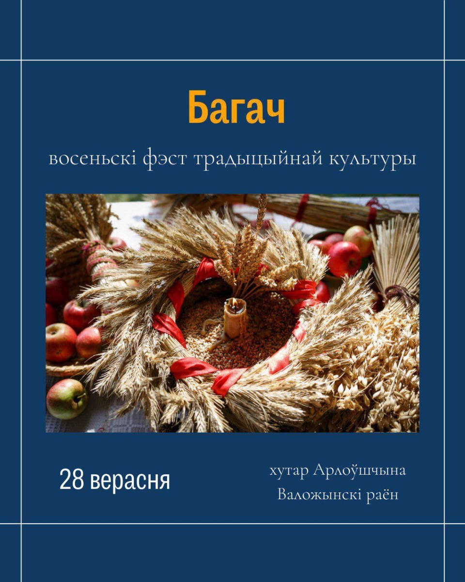 Восеньскі фэст традыцыйнай культуры БАГАЧ 2025 🍂👩🏼🌾 У народным календары Багач — гэта час, калі ўраджай сабраны, а ў хаце запальваецца першы агмень пасля лета. Васковая свечка ў лубцы з жытам — сімвал шчасця і дастатку на ўвесь год! 🗓️ 28 верасня ⏰ 12:30 📍хутар Арлоўшчына (Ракаўскі с/с, Валожынскі раён) 💰12 рублёў / 6 рублёў (для дзяцей 6-12 гадоў) / бясплатна (дзеці да 6 гадоў) ❗ падрабязнасці ў арганізатара festclub.by 🌾 Галоўная падзея — ссыпанне агульнага Багача! Арганізатары запрашаюць кожнага прынесці жменьку зерня і стаць часткай гэтага цудоўнага абраду. Не проста глядзець, а быць у цэнтры падзей! 🌾 ✨ Што вас чакае? — урачыстае шэсце і народныя абрады, — народныя танцы і жывая музыка, — фальклорныя гурты, — кірмаш і крутыя фота-зоны, — майстар-класы па рамёствах і многае іншае!