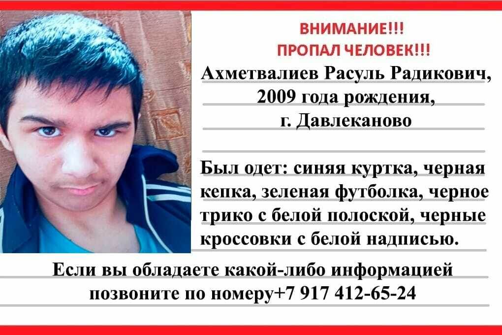 Родственники из Давлеканово разыскивают Расуля Ахметвалиева 17 сентября Отдел МВД по Давлекановскому району сообщил, что в Давлеканово пропал несовершеннолетний Расуль Ахметвалиев. Молодой человек, 2009 года рождения, ушел из дома и его местонахождения не известно. Был одет в синюю куртку, черное трико с белой полосой, зеленую футболку, черную кепку. На ногах - черные кроссовки с белой надписью. К тем, кто обладает какой-либо информацией о подростке, просьба позвонить по телефону: 89174126524. Вечером того же дня несовершеннолетний нашелся.