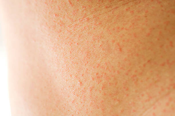 - Выглядит как мелкая красная сыпь, иногда с волдырями