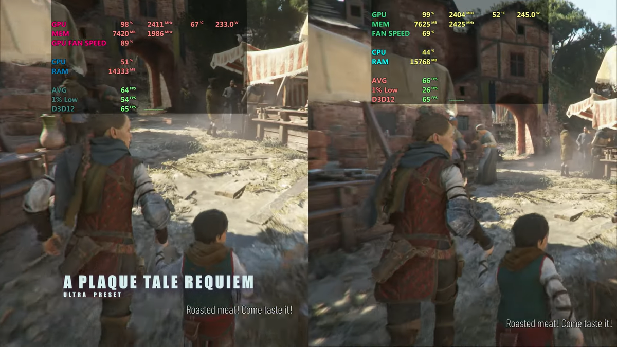 A Plague Tale Requiem запускалась с ультра-пресетом. В среднем в ней удалось получить 66 к/с (6800 ХТ) и 68 к/ (7800 ХТ).