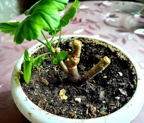 И чтобы герань активно и пышно цвела, обрезаем так, чтобы оставалось 2-3 узла, из которых затем появляются новые побеги, т.е. почти «под пень». Если ствол не одревесневший, можно обрезать до начала разветвлений или чуть выше узла на 3-5 см.