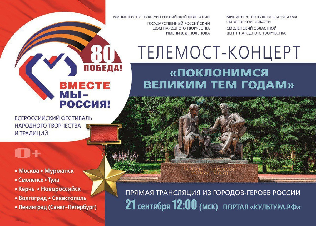 Масштабный телемост объединит все города-герои нашей необъятной Родины! 21 сентября в 12:00 на портале «Культура.РФ» начнется трансляция телемоста «Поклонимся великим тем годам», которая станет кульминацией Всероссийского фестиваля-праздника народного творчества и традиций «Вместе мы – Россия!», посвященного 80-летию Великой Победы и Году защитника Отечества. Смоленск — город-герой, крепость, защищавшая Русь от врагов, символ мужества и стойкости. Историю нашего города в театрализованном представлении по мотивам произведения Александра Твардовского расскажут: народный самодеятельный театр "Первый КласС" (г. Рославль), народный самодеятельный коллектив ансамбль танца "Славяне" (г. Вязьма), арт-группа "Смоленские мужики" (г. Смоленск). Ссылки на трансляцию: www.culture.ru/live/broad... *Проект направлен на популяризацию этнокультурного достояния, самобытной традиционной художественной культуры народов России, сохранение и укрепление традиционных российских духовно-нравственных ценно