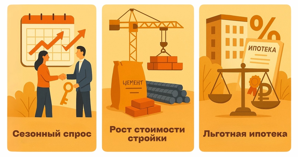 Осень — традиционный горячий сезон на рынке. Люди возвращаются из отпусков, закрывают сделки до конца года, и спрос подталкивает цену вверх.