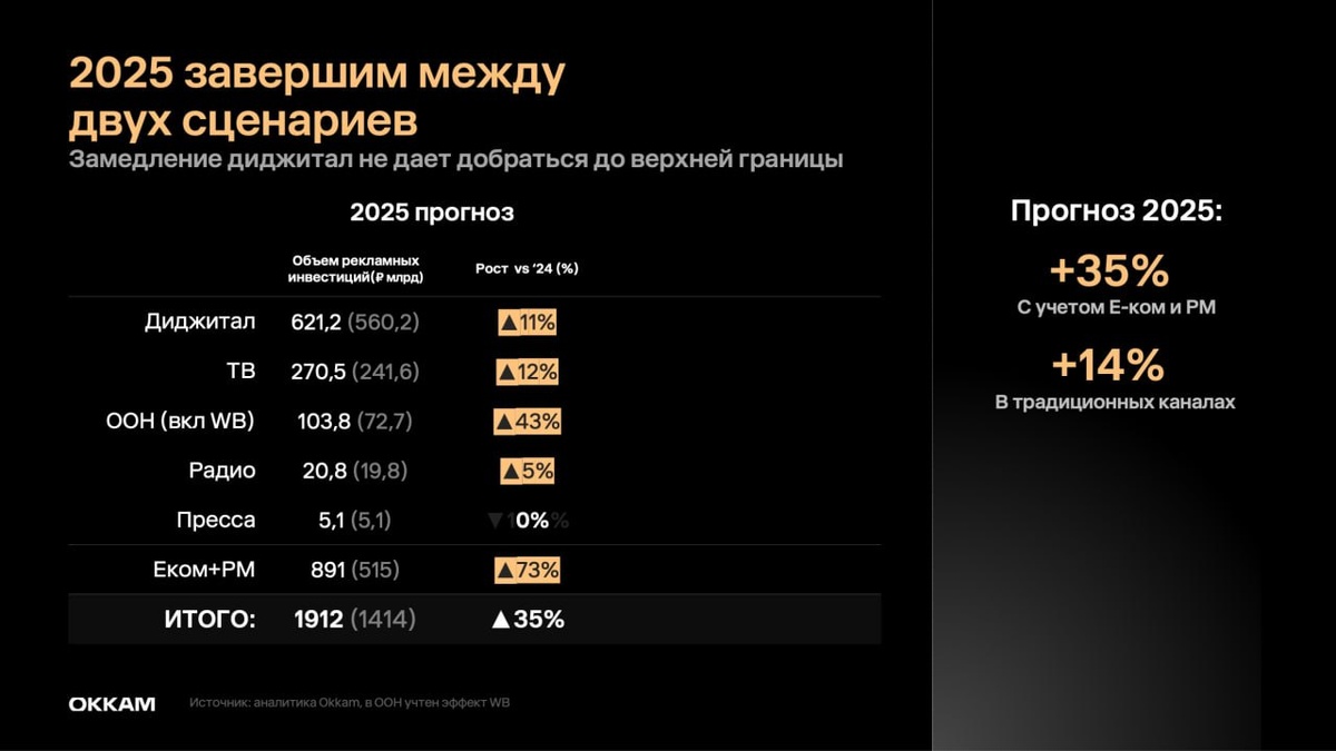 📈 Okkam ждет роста рекламного рынка на 35% по итогам года Группа Okkam на ежегодной конференции «О цене и ценности» представила обновленный прогноз на 2025 год. E-com и ретейл-медиа подтвердили ожидаемый ранее прирост, а наружная реклама растет значительно быстрее ожиданий. Что нас ждет в 2026 году? ▪️ Рост рынка в целом замедлится до 28% с учетом e-com и retail media, а рост в традиционных каналах составит 12%. ▪️ Рост отрыва самых крупных рекламодателей, богатых брендов, от остального рынка. ▪️ Состояние рынка телерекламы характеризуется как стабильное: по данным на сентябрь 2025 года, 50% инвентаря телеканалов на 2026 год уже распродано в ходе ранних торгов (аналогичный показатель сентября в минувшие годы составлял 35–50%). ▪️ Самый заметный тренд в наружной рекламе — кратный рост количества рекламодателей. В цифровой рекламе получить качественный контакт становится сложнее, поэтому в Okkam отмечают рост спроса на охватные инструменты по типу Brand Boom, когда одновременно за