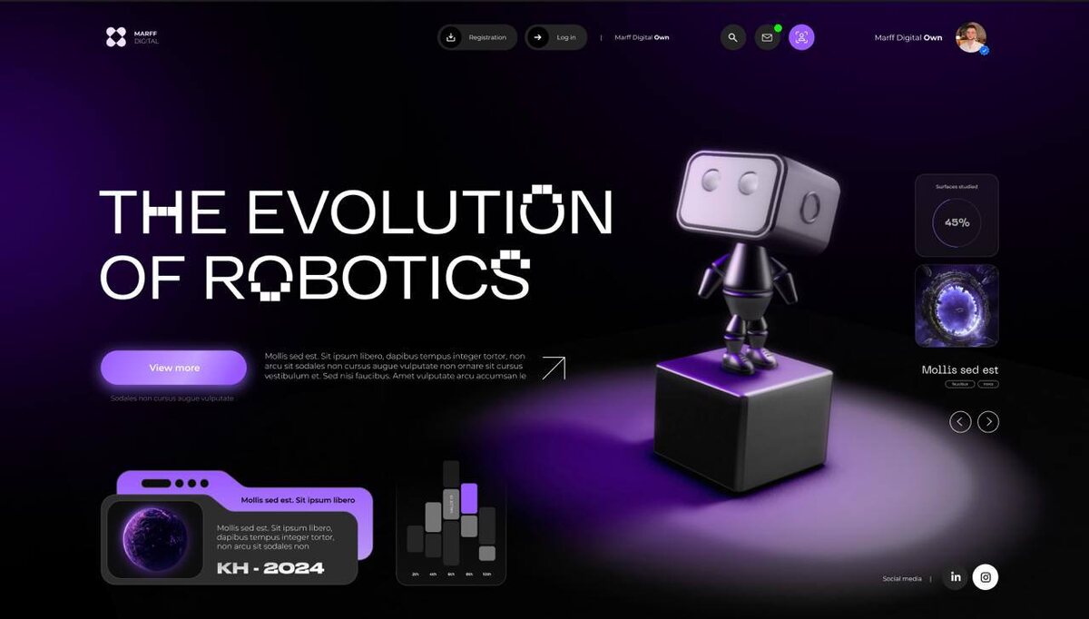 🤖 The Evolution of Robotics Создали сайт в духе Pixar + Neuralink: минимализм, объём и персонаж, который цепляет с первого взгляда. Что сделано: — Сконструировали 3D-робота — бренд-героя, который говорит за продукт — Собрали визуал с фокусом на wow-эффект и глубину света — Подчеркнули технологичность через фиолетовый градиент, глич-эффекты и плавные тени — Зашили геймификацию: прогресс, карточки, лейблы, интерфейс как из метавселенной — UI-интерфейс сбалансирован с арт-объектом: всё функционально, но смотрится как digital sculpture 🔙 назад к списку кейсов 👉🏼 создадим визуал под ваш продукт? @vitrium_team