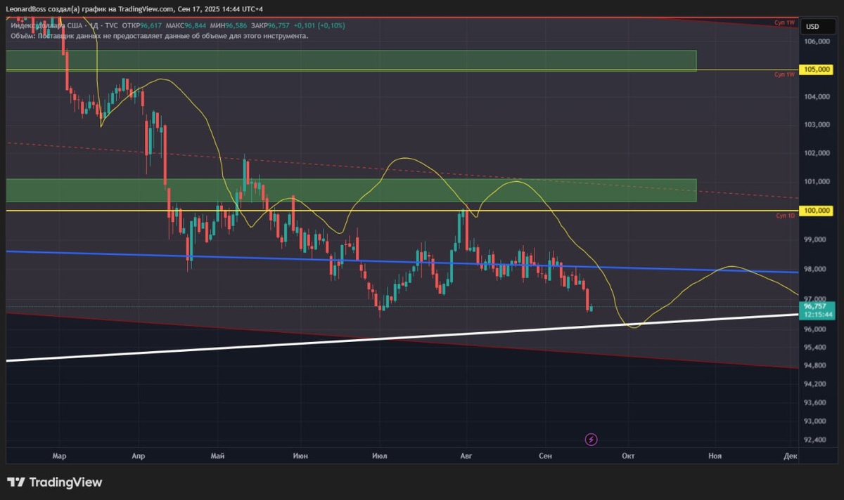 В ответ на пост #DXY 🔽🔽🔽 Рынок шатают из стороны в сторону, друзья, и это норм в текущей ситуации = не берите близко к сердцу, лучшим решением будет просто побыть в стороне и палить свои нервы!! ⚠️Индекс бакса практически приехал к моим ожиданиям, показав дополнительное снижение с момента крайнего поста. Данная конструкция очень скоро начнет показывать результат на крипто рынке! Просто не суетимся и держим терпение в руках, остались считанные дни, максимум пару недель!! P.s. сегодня важное решение по ставке ФРС в 21:00ч. Кто как думает, коллеги, снизят ставку, или дед Пауэл снова прокатит деда Трампа?? Ставьте пальцы, потом сверимся: ✔️ Да, снизят: 👍 ❌ Нет, Трамп разгонит ФРС: 👎