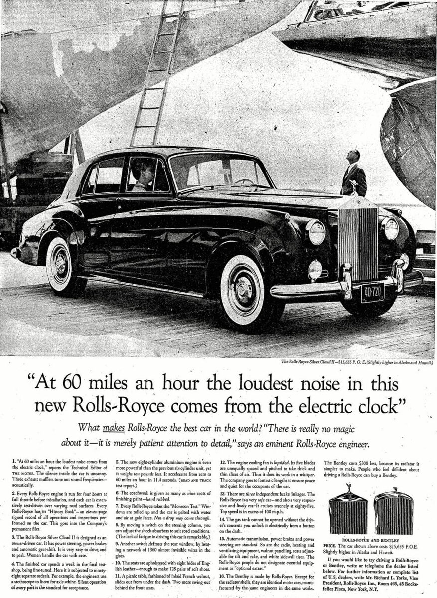 Ну что ж, старые читатели моего канала знают мою любовь к цитированию Экклезиаста - ничто не ново под луной. И если мы пытаемся внедрять идеи всяких Огилви, Бернбахов и Барнеттов, то они же тоже откуда-то брали свои идеи? Ну, во-первых никто не отменял классических сюжетов мировой литературы (а в те времена, боюсь, образованная часть общества была поначитаннее нас), а во-вторых, а кто сказал, что до них рекламы не было?) После окончания Второй мировой войны Великобритания активно нуждалась в экспорте как источнике валюты, и одним из "шакалов", ринувшихся на освоение и захват новых рынков, стал концерн Rolls-Royce, нехило так заработавший на поставках авиационных двигателей в ВВС острова. Но, к сожалению для них, война закончилась и надо было искать новые источники дохода. В 1950-е годы крупнейшим автомобильным рынком мира стали США, разбогатевшие на войне. Для Rolls-Royce это был естественный выбор, поскольку в Великобритании рынок был слишком мал, чтобы поддерживать производство лю