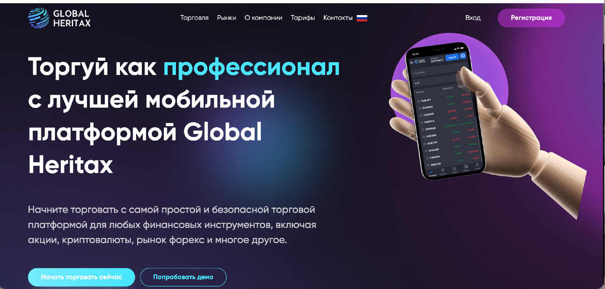 Сайты trade.globalheritax.com и globalheritax.com позиционируют себя как инвестиционно-трейдинговые платформы. На страницах обещают стабильный доход, удобную торговлю и поддержку «профессиональных аналитиков».