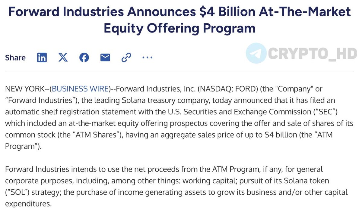 🤩 #SOL В Forward Industries привлекут еще $4,000,000,000 для покупки Solana – релиз Ранее: закупили SOL на $1,58b Crypto Headlines
