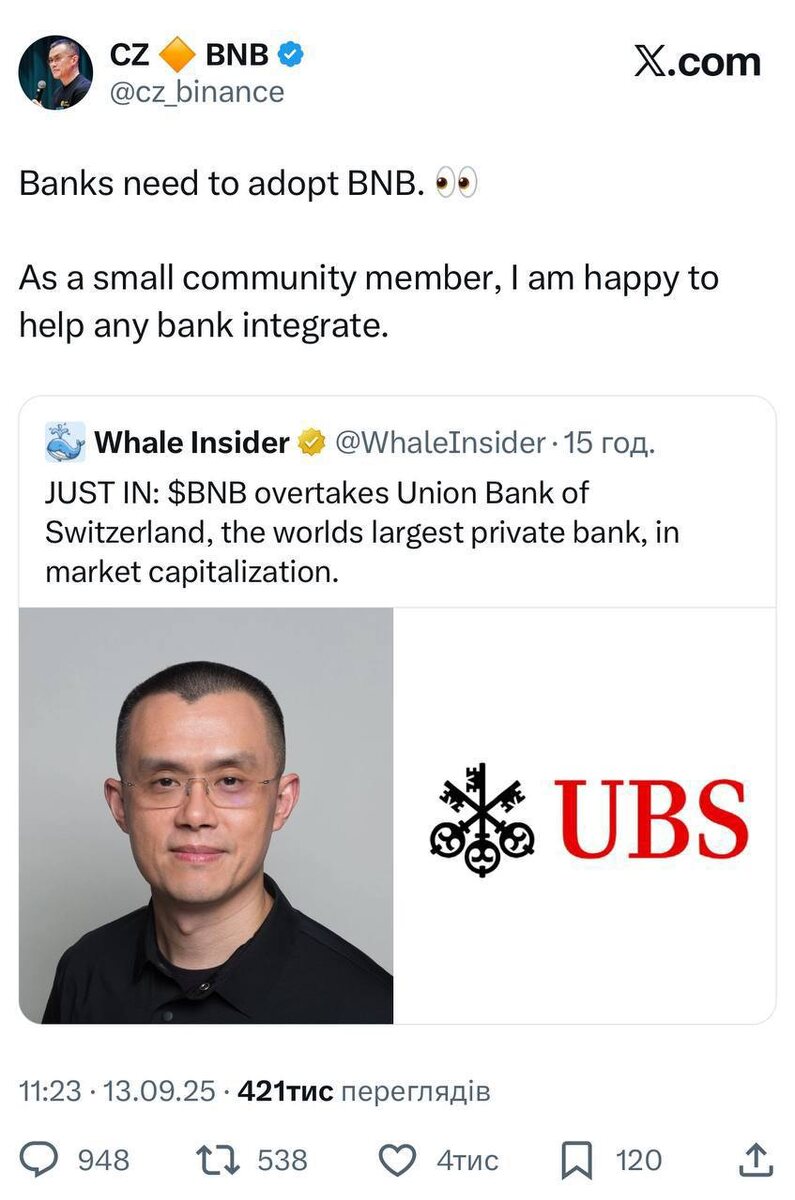 CZ предложил банкам интегрировать $BNB Глава Binance заявил, что готов лично помогать любому банку, который решится внедрить токен в свои сервисы. 🎁 Купить NFT Telegram на Tonnel или Portal Крипто-Визионер | Подписаться
