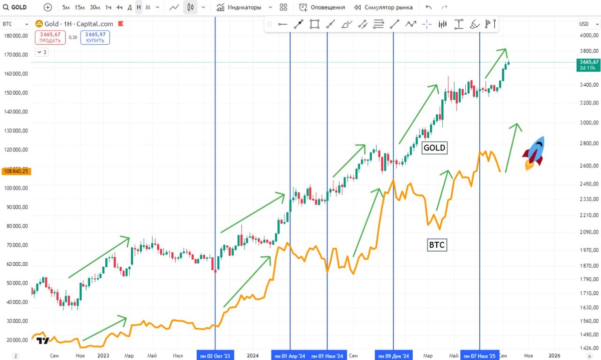 🪙 На прикрепленной картинке видно, что Биткоин всегда следует за золотом, но с небольшим отставанием!