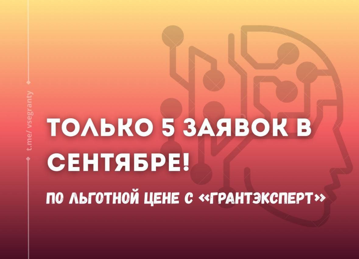 Только пять заявок в сентябре! Друзья, наша команда готова принять в работу до пяти заявок на подготовку грантов до 25 сентября — по цене от 25 000 рублей. Мы подготовим их с помощью нашего приложения, чтобы показать вам его преимущества. Хотите получить услугу по подготовке заявки на грант по льготной цене? Напишите нам! Писать сюда: @vsegrantityt