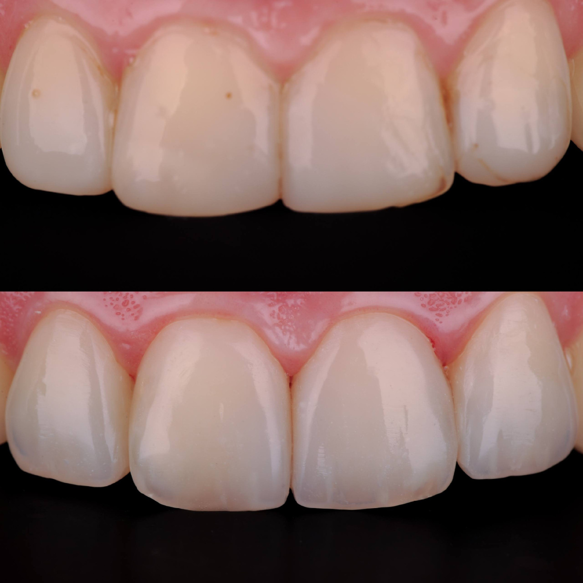 Были заменены четыре старые реставрации, исчерпавшие свой срок службы. Новая работа выполнена в натуральных, естественных оттенках, которые идеально гармонируют с цветом собственных зубов пациента. Проведенная работа: Результат: Реставрации визуально неотличимы от естественных зубов и полноценно выполняют свою функцию.