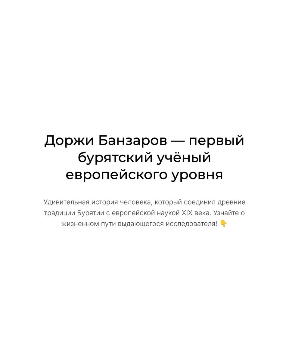 Доржи Банзаров (1822–1855) — первый бурятский учёный европейского уровня, востоковед и автор классического труда «Чёрная вера, или шаманство у монголов». Владел восточными и европейскими языками, работал в Азиатском музее Петербурга, был членом Русского археологического и географического обществ. Его жизнь стала символом соединения бурятской традиции и мировой науки. 👉 Больше о выдающихся личностях Бурятии смотри в нашем канале: https://t.me/universe_buryat