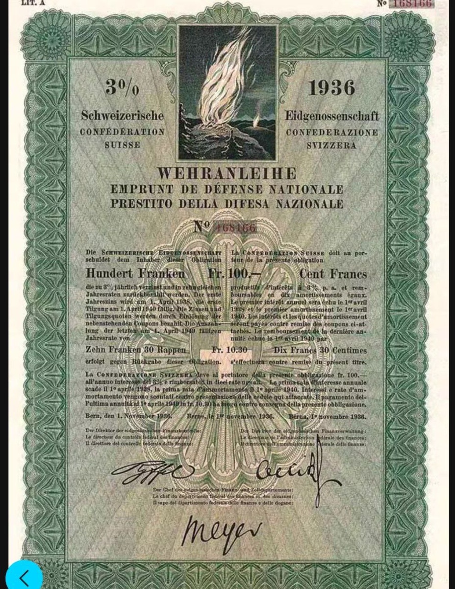 Оборонные облигации 🇨🇭 1936 года Угроза войны со стороны национал-социалистической Германии побудила Швейцарию выпустить в 1936 году первую федеральную оборонную облигацию. Это было связано с тем, что регулярного бюджета не хватало на модернизацию армии и укрепление обороноспособности. Срок обращения облигаций составлял 30 лет, процентная ставка - три процента. Она принесла Конфедерации около 235 миллионов швейцарских франков, что соответствует примерно четверти годового дохода правительства 💬 Тогда немцы забыли на войну прийти . Но сейчас все по другому 🫡