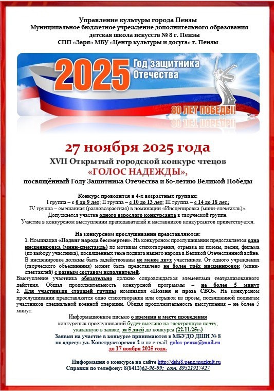 📢Приглашаем к участию в XVII открытом городском конкурсе чтецов "Голос надежды", посвященном Году Защитника Отечества и 80-летию Великой Победы! ✅Подробнее о конкурсе и условиях участия см. https://dshi8.penz.muzkult.ru/event/131383460 #ДШИ8Пенза #культура_58 #детиПенза #Год_Защитника_Отечества