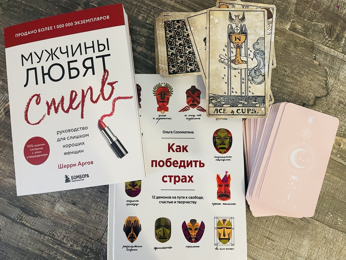 Не все еще освоены толком, но в процессе.:) 🥰 Колода винтажного таро. Очень эстетично, супер красиво. Рисунок - классика Райдера Уэйта. Качество отличное, инструкции внутри нет, но она и не нужна.:) колода чисто для коллекционеров, не учебная, а радующая взгляд. 💭 Еще одна колода, с нежно розовой рубашкой, тоже безумно красивая и приятная, компактная (меньше стандартного размера, удобно кинуть в сумку в поездку), сами рисунки переосмыслены, мне показались грубоваты, размыты, угловаты. Есть книжечка в комплекте, прям отличная классная интерпретация. 😊 Книга “Как победить страх”. Главы со страхами идут как-то хаотично, но в конце каждой главы - конкретные практические упражнения и основные тезисы. Страхи в отношениях, в деньгах, раздутые страхи, тревога за детей, стыд и давление внешней среды и многое другое. Автор молодец, всё упаковала в небольшую книжку и дала шаги что делать. ❤️🔥 Еще книжка. Руководство для слишком хороших женщин. Рекомендую всем слишком хорошим женщинам.:))🖤 Г