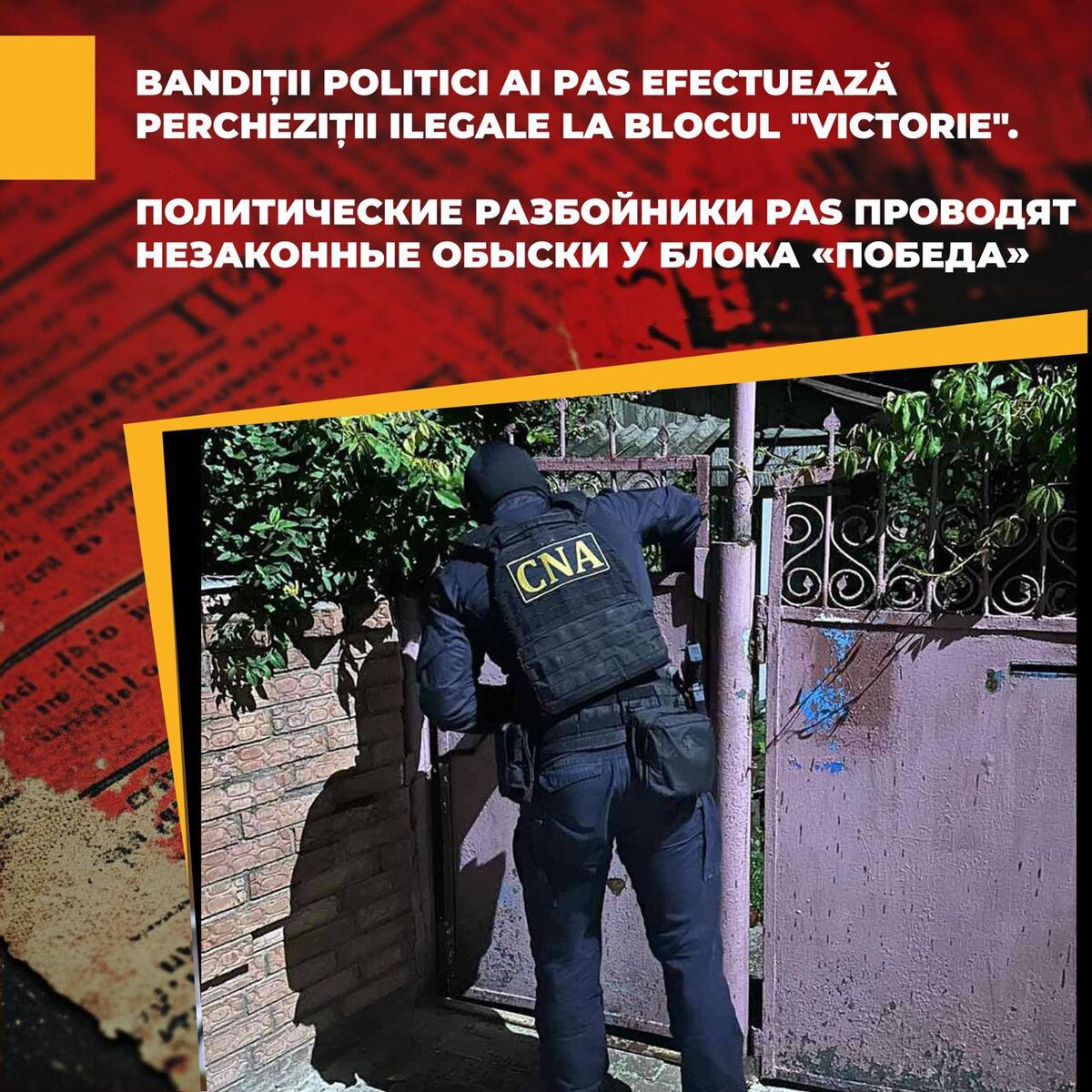 Pe măsură ce alegerile se apropie, terorismul politic devine și mai agresiv. Astăzi, ciuma pasistă a năvălit peste colegii noștri, lideri și reprezentanți ai partidelor din componența blocului "Victorie". Polițiștii le-au răscolit casele în fața rudelor și copiilor. Asemenea raiduri asupra susținătorilor noștri au loc în întreaga țară. Ieri, au devastat redacțiile instituțiilor media independente "Primul în Moldova" și "Canal 5", confiscând toată tehnica. Oamenii care simt că au forță și putere nu se comportă ca niște psihopați. Așa acționează cei aflați la limita disperării și fricii. PAS, sfârșitul vostru e aproape. Dar nu vă panicați — veți fi judecați nu după legile banditești (deși meritați asta), dar conform legii. *** Чем ближе выборы, тем агрессивнее политический террор. Сегодня пасовская чума ворвалась к нашим соратникам, лидерам и представителям партий, входящих в блок «Победа». Полицейские перевернули вверх дном их дома — на глазах родных, детей. Такие налеты на наш