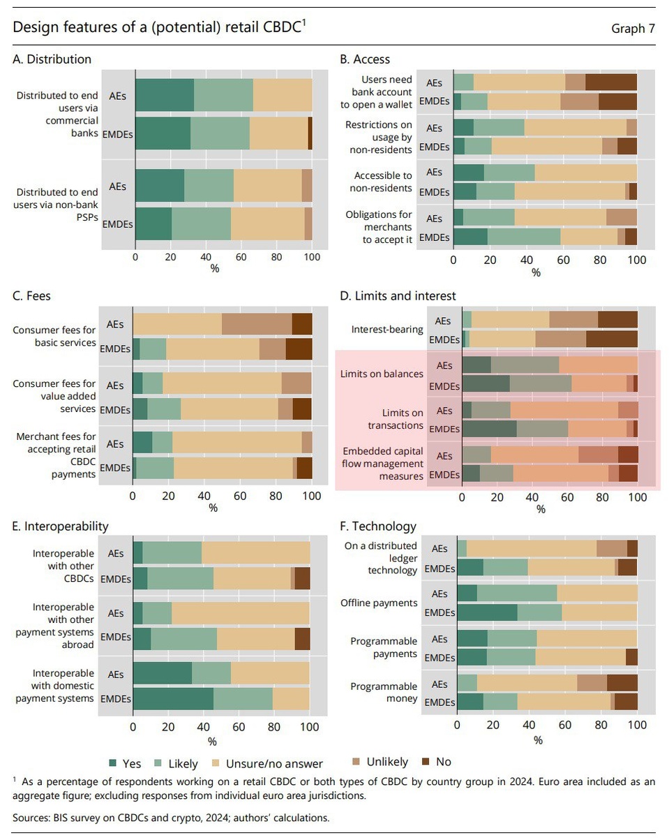 Главный источник страшилок я выделил красным: больше половины ЦБ (включая, к примеру, ЕЦБ!) ожидают, что будут введены лимиты на общий размер баланса кошелька в "цифровой валюте". Четверть ЦБ развитых стран и больше половины - развивающихся, хотят введения лимитов на величину транзакции, небольшая доля центральных банков считает, что в цифровую валюту стоит встроить инструменты для управления потоками капитала.