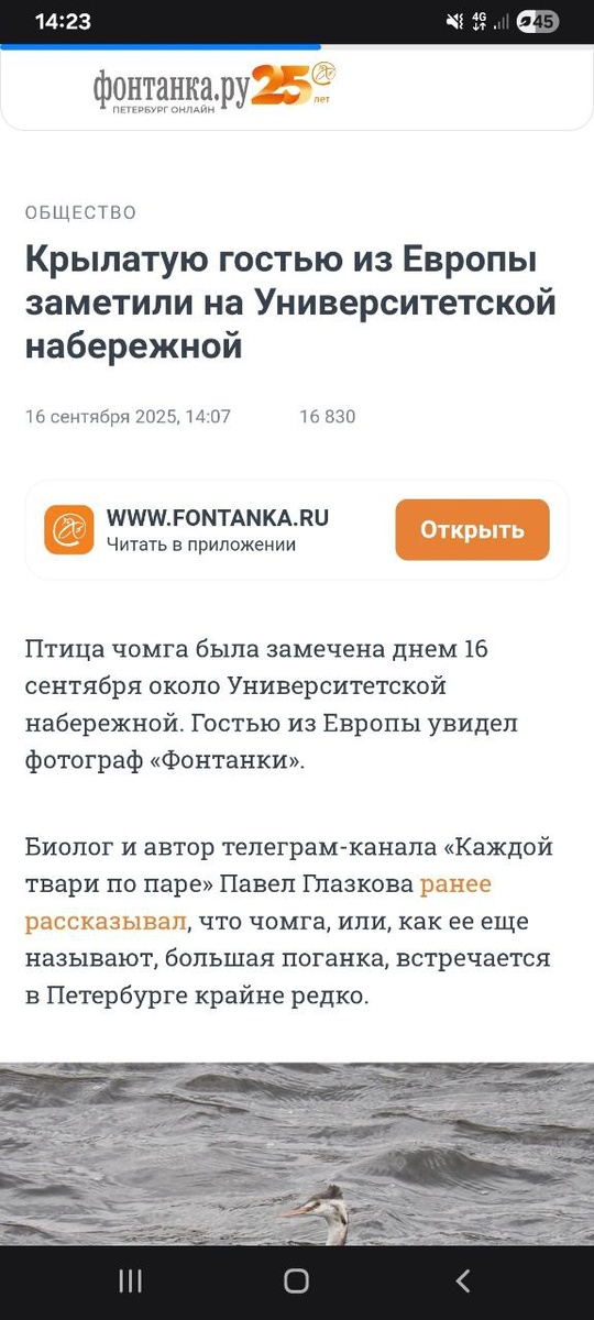 Обожаю новостные каналы. Напишут белиберду и ссылаются на Глазкова. Ну, даже я знаю, что чомга у нас вообще ни разу не редкость, уж он точно не мог такого сказать. Пойти что ли предложить свои услуги фонтанке в качестве журналиста по птичкам? 😁