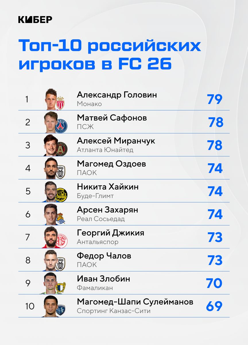 Один недавно обыграл Месси. В FC 26 немного российских футболистов. EA Sports пока не вернула РПЛ и сборную, но выдала карточки Ultimate Team нашим легионерам. Кибер рассказывает главные факты о лучших отечественных игроках футсима. 📌 Все про EA Sports FC 26 в одном месте: топ-рейтинги и лучшие карточки, обзоры механик и не только ● Александр Головин – лучший российский футболист FC 26. Лидер «Монако» провел не слишком удачный год и потерял сразу два балла, но EA снова не нашла ему альтернативы. А вот у Konami хавбека обошел вратарь «ПСЖ» Матвей Сафонов. 📌 10 лучших российских игроков в eFootball 2026. Сафонов обошел Головина, а Джикия – в Турции ● Десятка лучших заметно обновилась. Антон Миранчук вернулся из «Сьона» в «Динамо», Далер Кузяев ушел свободным агентом из «Гавра» и пока не нашел новый клуб, а Юрий Лодыгин и Станислав Ильюченко перешли в менее статусные команды Греции и Южной Кореи. ● В топ-5 ворвался вратарь норвежского гранда «Буде-Глимт» – Никита Хайкин. Кипер зажег в п