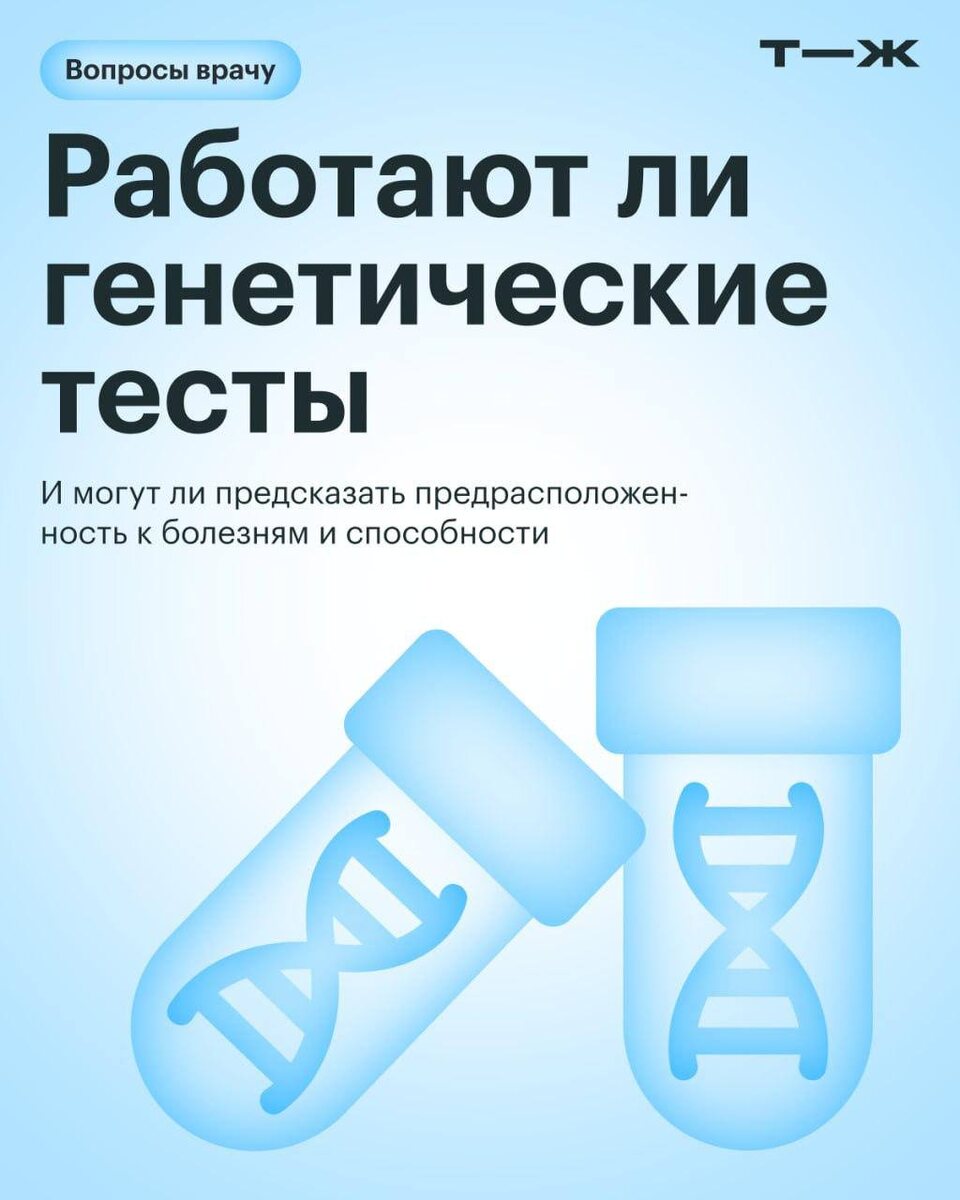 Сдать слюну на анализ и за 25 000 ₽ узнать, к каким болезням у вас есть предрасположенность и в какой профессии вы можете преуспеть, — правда ли такое возможно? За последние пять лет жители России стали тратить на генетические тесты в 4,4 раза больше денег. 🧬 Многие лаборатории обещают, что с помощью такого теста можно узнать, кем были ваши предки, чем вы с большой вероятностью можете заболеть и в каком спорте преуспеть. А еще — от каких препаратов у вас могут возникнуть побочные реакции и какие у вас есть особенности метаболизма. ⬇️ Наш медицинский редактор Екатерина Кушнир изучила, как работают коммерческие генетические тесты, что они на самом деле могут показать и стоит ли тратить на них деньги: https://t-j.ru/z-tg/gentest-true-false/ #вопросы_врачу