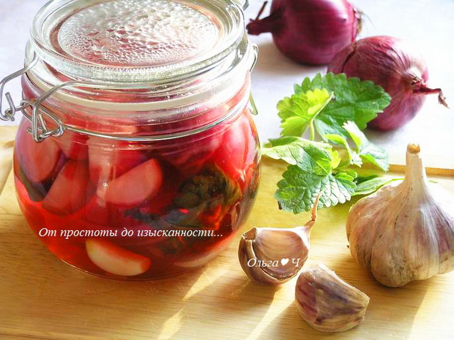 2 ст. л. растительного масла Приготовление: Промойте, очистите и крупно нарежьте овощи. Для маринада смешайте воду, уксус и мятный сироп, доведите до кипения. Добавьте веточки мяты и подготовленные овощи, снова доведите до кипения (но не кипятите!), снимите пенку, откиньте овощи на дуршлаг. Маринад поддерживайте при 80*С на маленьком огне. На дно стерилизованной банки (0,5 л) положите веточки мяты, добавьте овощи. Залейте маринадом, сверху добавьте масло. Закупорьте, переверните и дайте остыть. А через 2 недели можно пробовать. Приятного аппетита! Вам также могут понравиться