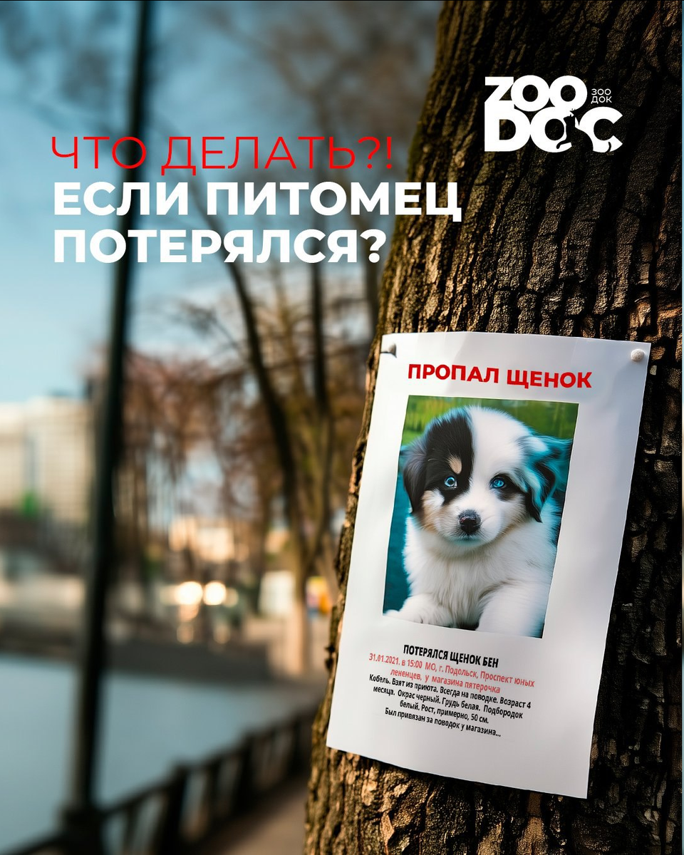Потеря любимца — страшная ситуация для любого хозяина. Но главное — действовать быстро и правильно. 1️⃣ Сразу начните искать — пройдитесь по району, зовите по имени, используйте знакомые игрушки или лакомства. 2️⃣ Спросите соседей и прохожих — часто питомца видят рядом с домом. 3️⃣ Позвоните в ближайшие ветклиники и приюты — туда могут привезти найденное животное. 4️⃣ Разместите объявления: 5️⃣ Проверьте службы отлова — иногда питомцев забирают туда. 💡 Главное — не теряйте времени и не отчаивайтесь: чаще всего потерявшиеся животные возвращаются домой, если хозяин активно их ищет. 👉 А через ZooDoc можно заранее найти ближайшую клинику для чипирования или заказа адресника.