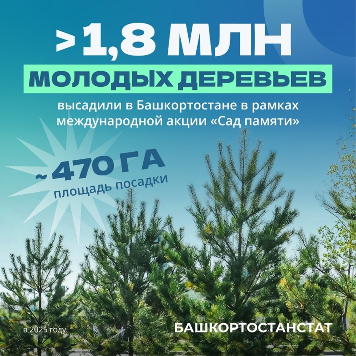 Республика вошла в число лидеров по посадке деревьев в рамках акции «Сад памяти». В этом году в республике уже высадили более 1,8 миллиона молодых деревьев на площади около 470 гектаров. Иными словами, практически одно новое дерево на каждых двух жителей региона, сообщает Башкортостанстат. Это результат работы сотен тысяч людей. Такой вклад помогает сохранить леса и увековечить память наших героев», отмечается в сообщении. Республика также отличается количеством мест, где высажены памятные деревья. В год юбилея Победы появились особые геоглифы со словами «Победа», «80», «Родина Победы» и другими. Инфографика с сайта Башкортостанстата.