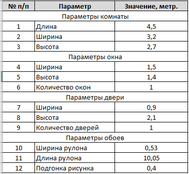 Всем привет! Давайте сегодня создадим файл Эксель, который будет рассчитывать необходимое количество рулонов обоев для оклейки комнаты. Исходные данные такие: Прямоугольная комната, в ней есть окно, есть дверь. Расчет должен учитывать смещение рисунка обоев. Сделаем промежуточные расчеты: Здесь применены следующие формулы: И итоговые расчеты: Разберем расчеты подробнее: п.1.: Кол-во полотнищ (полос)
