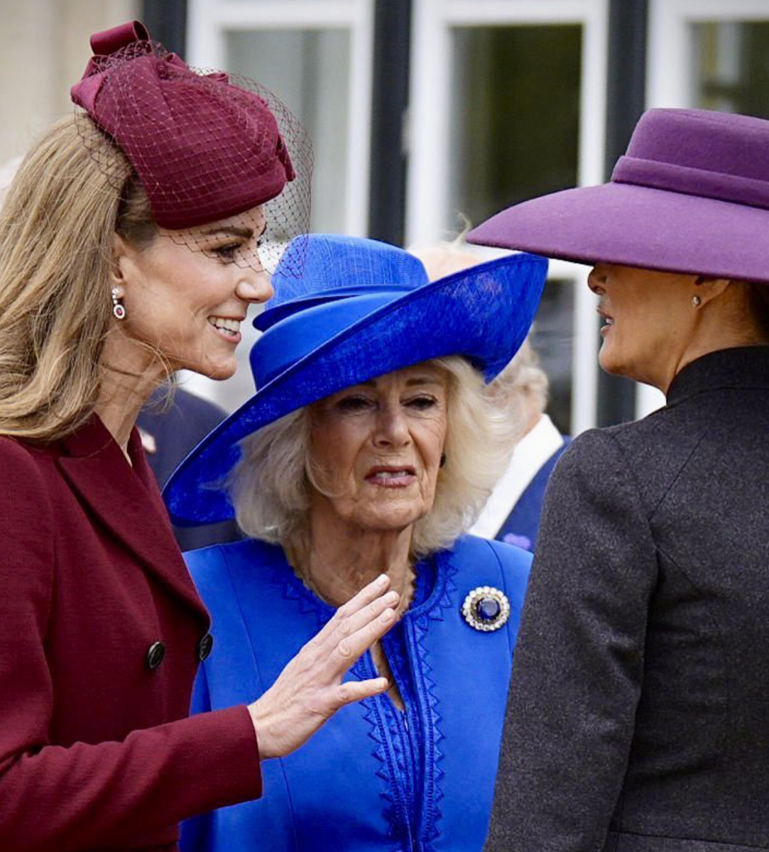 Какие бы магические пилюли не принимала Ее Величество, могу сказать об ее облике одно: королевский синий даже ей идет. А так, конечно... Не в меру широкие, почти садовые перчатки, невпопад сумочка Bottega Veneta - совсем не шли к столь элегантным, хорошо подтянутым колготкам и красивейшим в мире туфелькам Eliot Zed. Не могли устоять перед внезапно ожившей от синусита консорт гости. Руку сжимали аккуратно. Старались улыбаться и вести себя достойно. Лишь олени не подчинялись протоколу и постоянно нарушали движение процессии. Чтобы доставить американских гостей в Виндзорский замок, король подал кареты. Вот Мелания в Шотландском государствннном экипаже. Говорят, там рессоры получше. Встречали прилетевших на американском вертолете Трампа и его супругу Уэльские. Мелания выдержала траур по почившей герцогине Кентской. Даже фиолетовый считается в королевских семьях цветом траура, так что первая леди весьма корректна. И похожа на статуэтку. Некоторые это отлично заметили. Дона
