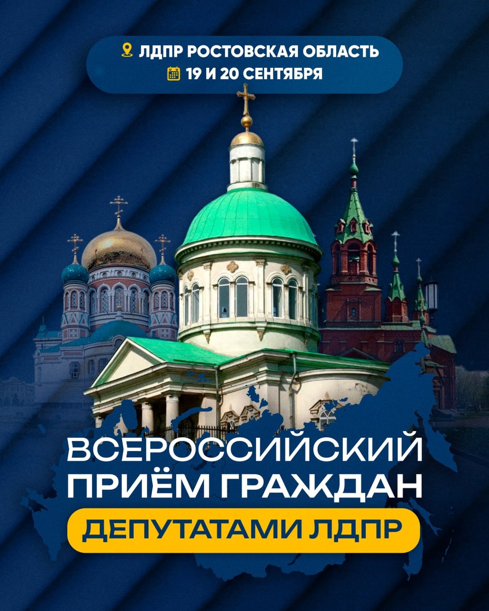 ЛДПР проводит очередной Всероссийский приём граждан! ❔ У вас есть проблемы или предложения? Столкнулись с неразрешимой задачей или помощь нужна вашим близким? 🏳️🏳️ не оставит вас наедине с трудностями! Любой житель Ростовской области сможет лично обратиться к парламентариям с наболевшими вопросами, рассказать о проблемах или предложить свои инициативы. ➡️ Традиционно приём будет проходить: ➡️ в общественной приёмной ЛДПР в Ростове-на-Дону, ул. Филимоновская, 128; ➡️ в Ростове-на-Дону на ул. Чудной, 10; ➡️ в приёмных местных отделений партии по всей Ростовской области. 📞 Запись на приём: 8-918-506-73-83 ❕ЛДПР рядом с каждым! Приходите, расскажите о своей проблеме — вместе найдём решение. Дорогие подписчики, благодарим Вас за поддержку! Ваши реакции, приглашения друзей и репосты позволяют нам развиваться. Не забывайте ставить 👍👍👍