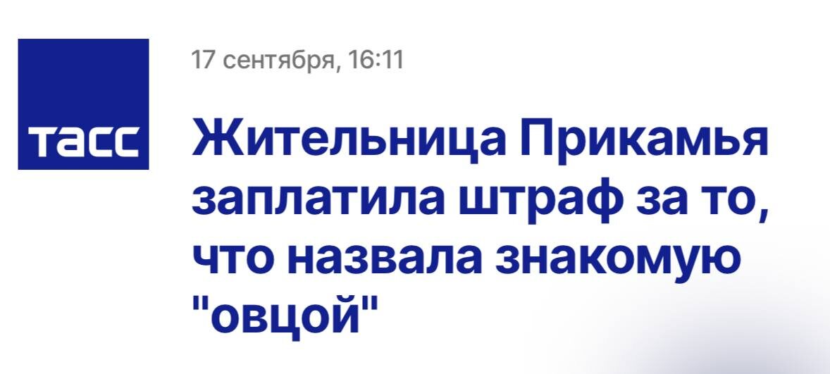 🚨 В Перми женщину оштрафовали на 20 тысяч рублей за оскорбление знакомой. Суд признал слово "овца" неприемлемым, ссылаясь на словари русского языка и ненормативную лексику. Деньги списали принудительно после отказа выплачивать добровольно.