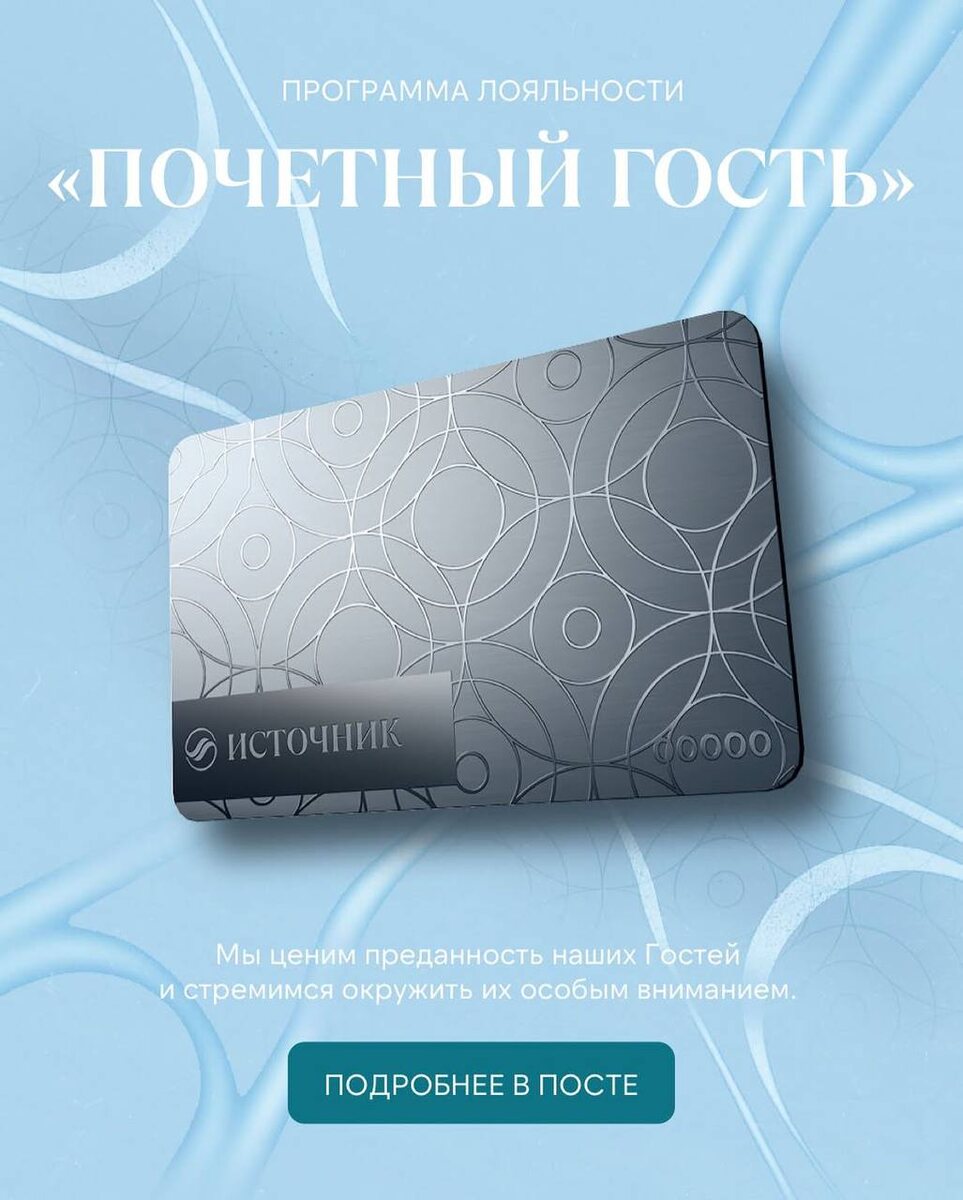 Программа лояльности «Почётный Гость». Мы высоко ценим доверие каждого, кто выбирает санаторий «Источник» для отдыха и восстановления. Для нас Гость – это особая личность, достойная исключительного внимания, изысканного сервиса и деликатной заботы. Именно поэтому была создана уникальная программа лояльности, которая объединяет в себе привилегии и знаки особого уважения. Став Почётным Гостем, Вы открываете для себя мир особых условий бронирования, персональных предложений и эксклюзивных преимуществ. После выполнения условий участия вручается именная карта с уникальным номером – символ признательности и ключ к миру утончённых возможностей, где каждая деталь продумана ради Вашего совершенства и комфорта. В «Источнике» мы верим: истинный отдых начинается там, где Гость ощущает себя по-настоящему ценным. 🫂