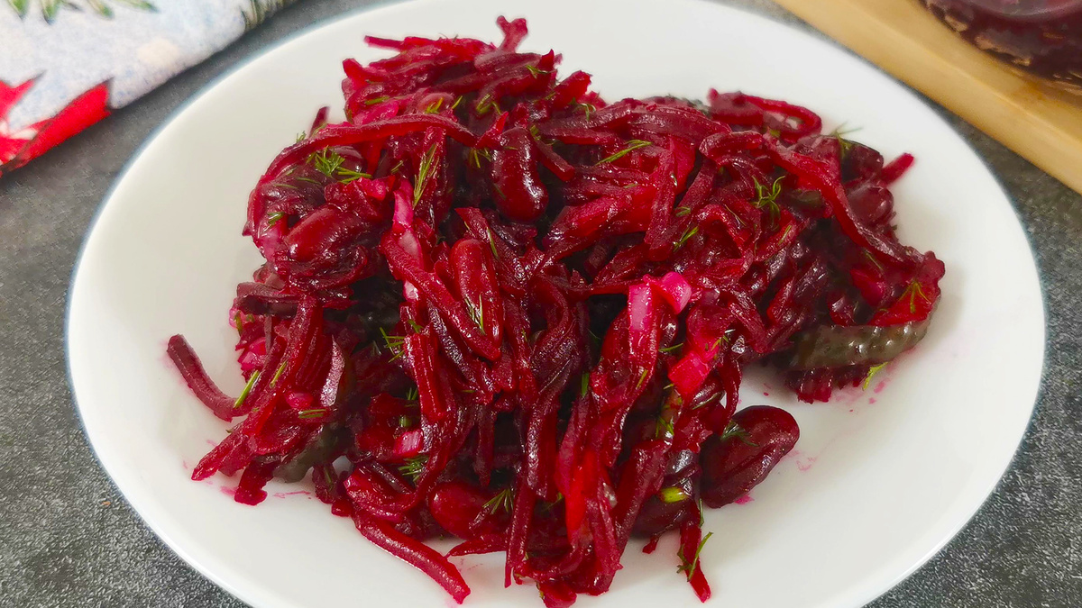 Представляем вашему вниманию уникальный рецепт салата из свеклы, способный удивить даже искушенного гурмана. Этот салат станет настоящей находкой для тех, кто ищет новые вкусовые сочетания и стремится разнообразить привычное меню. Благодаря оригинальной комбинации ингредиентов и особой технике приготовления, каждый кусочек наполнится яркими оттенками вкуса, гармонично сочетающими сладость свеклы, свежесть зелени и пикантность специй. Это блюдо не только порадует вас своей необычной подачей, но и принесет пользу организму благодаря богатству витаминов и минералов. Готовьте с удовольствием и наслаждайтесь неповторимым вкусом нашего салата из свеклы! 1. Вареную свеклу натереть на терке для овощей по-корейски. 2. В сковороду налить немного растительного масла, разогреть и обжарить мелко нарезанный до прозрачности. 3. Лук поперчить, перемешать, готовить еще 1 минуту и убрать с плиты. Дать ему остыть. 4. Маринованные огурцы нарезать брусочками и добавить к свекле. 5. Консервированную фасоль