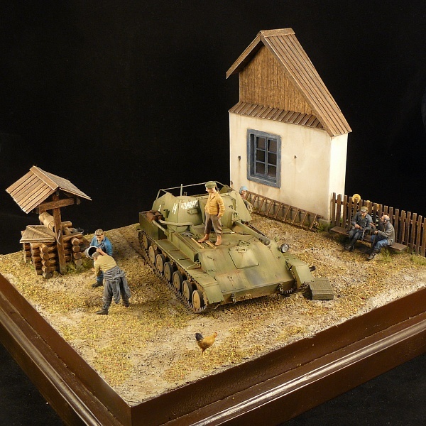 В минуты отдыха Андрей Мутафян MiniArt, MasterBox, 1:35 ===========================≠==== Эту диораму я сделал еще 2012 году. Хотелось сделать что-то по мотивам фильма и книги "На войне как на войне", есть там красочный эпизод про ночевку в деревушке. Но к тому времени СУ-100 у меня уже была на другой диораме, а делать практически ее клон СУ-85 (про которую и идет речь в книге) не хотелось. Так потихоньку идея трансформировалась в то что получилось. Немаловажную роль здесь сыграли колоритные наборы MasterBox. Самоходка СУ-76 от Miniart собрана практически "из коробки". Дом самодельный с использованием некоторых элементов Miniart, колодец, забор и скамья полностью самодельные. Фигурки, как я уже писал MasterBox, без переделки. Чуть не забыл, важная птица - из Японии, производства Tamiya. Красил все акрилом, тонировал химией AK. ================================ ================================