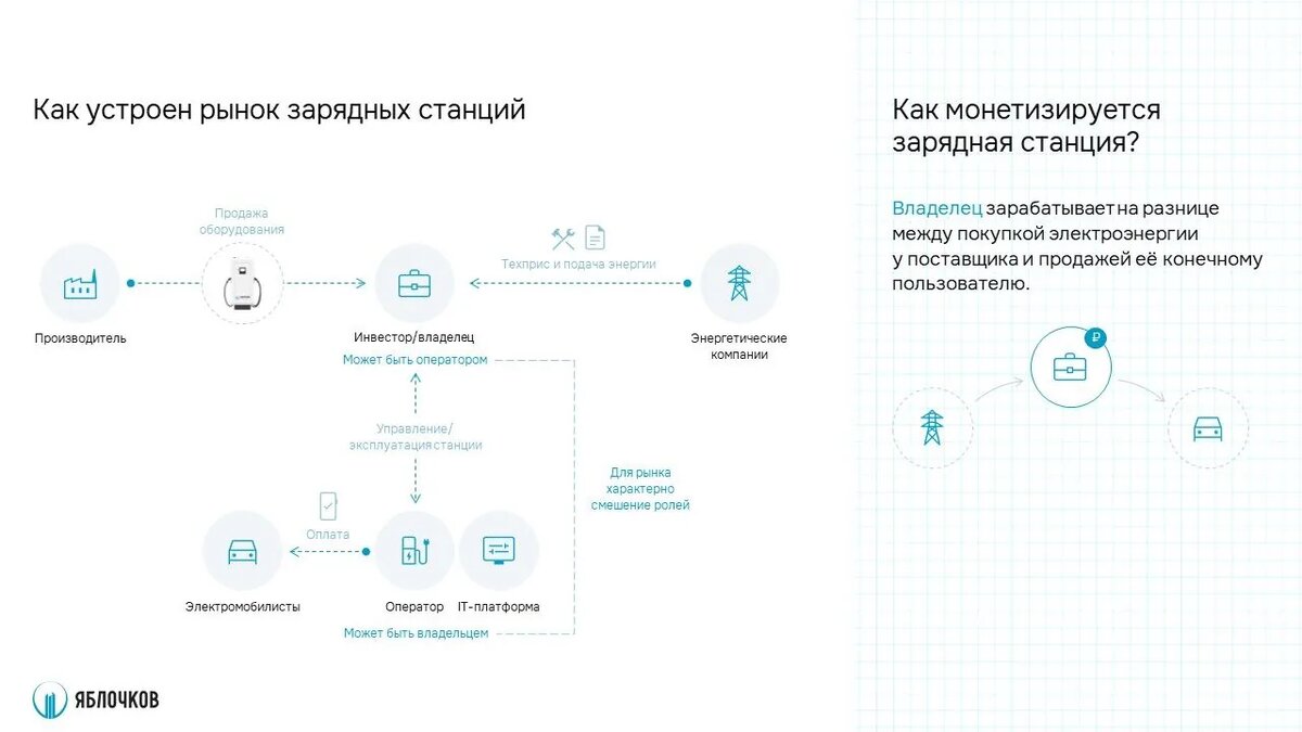 Зарядная индустрия и рынок инфраструктуры в России только формируются. Даже среди электромобилистов не все представляют, куда идут деньги за зарядную сессию, и какую роль в этой цепочке играет производитель. В этой статье мы разберём, как всё устроено: кто и у кого покупает зарядные станции, на чьей земле они устанавливаются, кто следит за их корректной работой и кто, в конце концов, получает выручку с каждого киловатта.