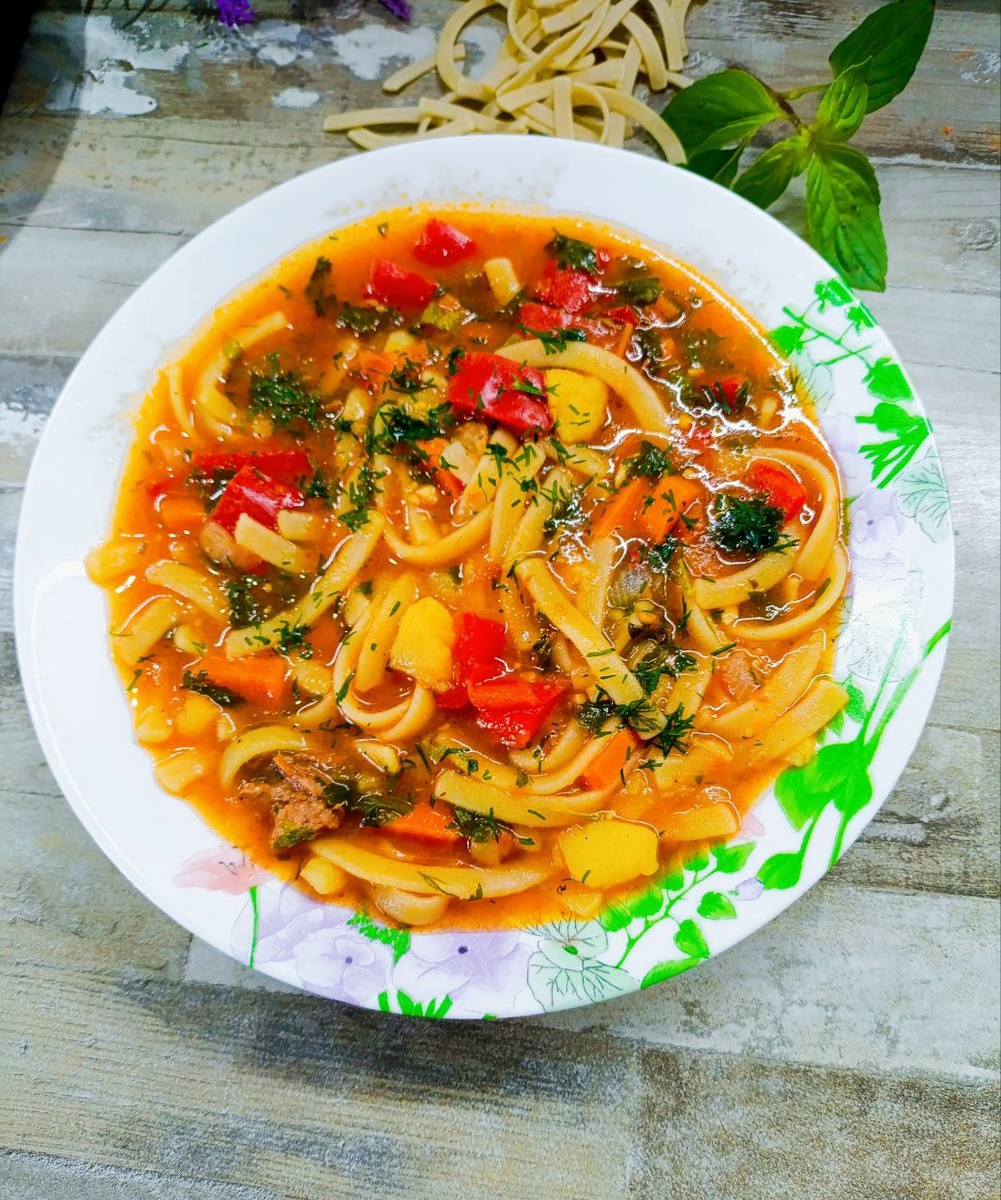 Аппетитный, насыщенный, ароматный и невероятно вкусный! 🤤 Что может быть лучше, чем тарелка горячего лагмана после долгого дня? Правильно, только ДВЕ тарелки! 😂 Сегодня лагман по классике! И не возимся с лапшой – берем готовую! 😉 Ингредиенты: • Говядина (мякоть) - 600 г • Картофель - 200 г (2 шт.) • Помидоры - 450 г (2 шт.) • Перец болгарский - 140 г (1 шт.) • Лук репчатый - 110 г (1 шт.) • Морковь - 150 г (1 шт.) • Чеснок - 4 зубчика • Томатная паста - 70 г • Мука - 1 ст. ложка • Масло растительное - 50 мл • Соль - 1 ч. ложка (или по вкусу) • Перец чёрный молотый - 1/5 ч. ложки (или по вкусу) • Кинза свежая - 2-3 веточки • Укроп свежий - 2-3 веточки • Базилик свежий - 2 веточки • Вода - 500-700 мл • Лапша для лагмана (готовая) - по вкусу 🍜 Но вы же помните, что я делаю на свой вкус😘 Поэтому на фоточках мои пропорции 🤣🤪 Я, правда, сварила бульон на говяжьей косточке еще вчера вечером! Сегодня очень быстро, поэтапно обжарила овощи, заложила их вместе с картофелем, а за 10 ми
