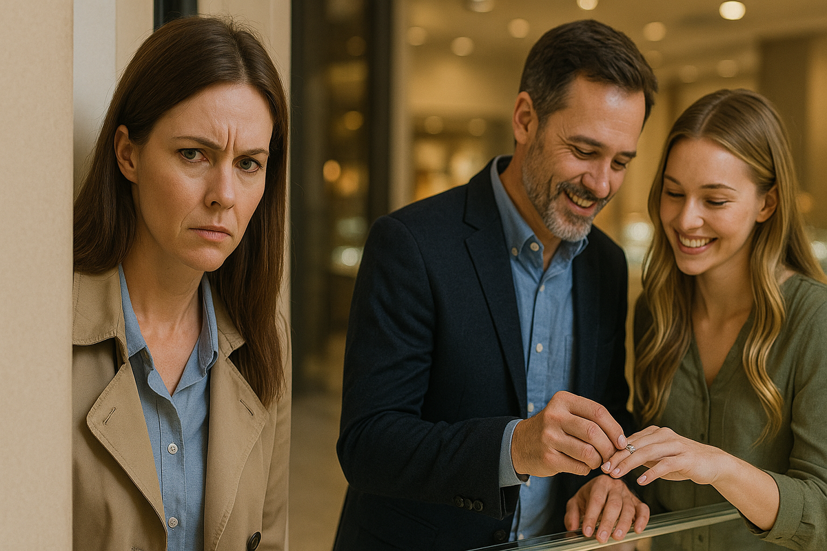 За прозрачной витриной она увидела знакомую фигуру. Это был он — её муж. Но рядом стояла молодая женщина, кокетливо улыбавшаяся и держащая его под руку. На их лицах светилось счастье, а продавец перед ними раскладывал бархатные коробочки с кольцами.