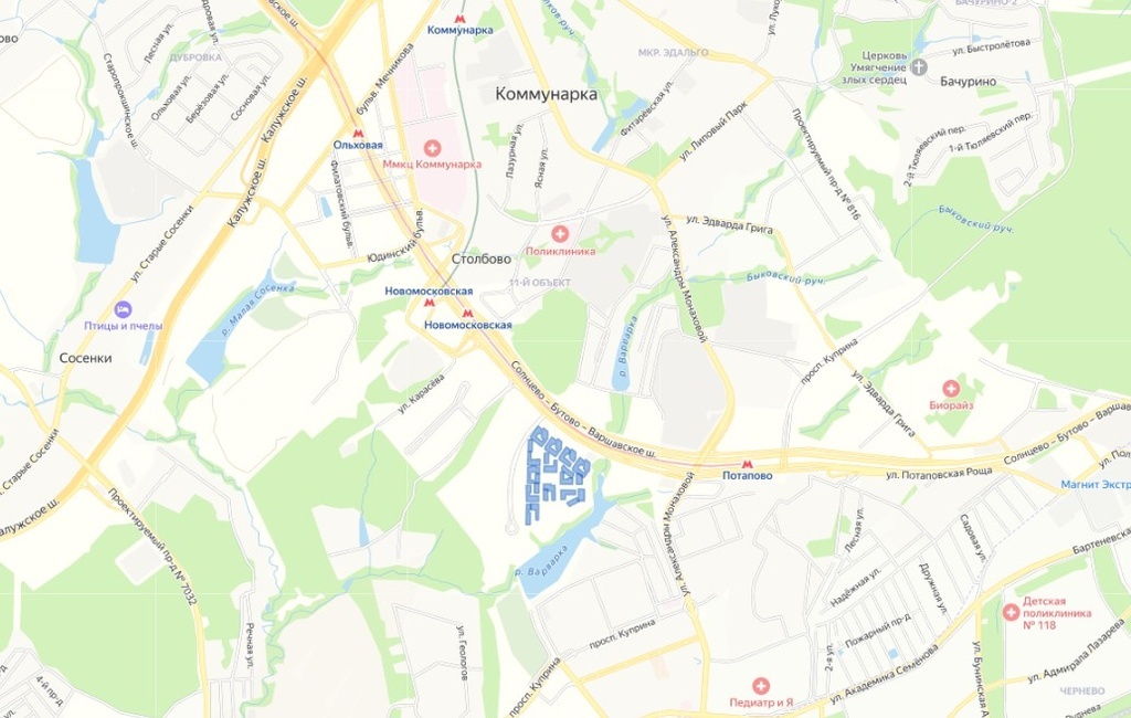 Локация находится на юго-западе Новой Москвы, в среде, где активно растут новые кварталы и одновременно остаётся больше воздуха, чем в пределах ТТК. В окружении — низкая этажность исторической застройки, локальные деловые площадки, вода и небольшие зеленые участки. По ощущениям это гибрид городского и пригородного формата: инфраструктура уже есть, плотности центра — нет, воды и деревьев заметно больше, чем в типичных «спальниках».