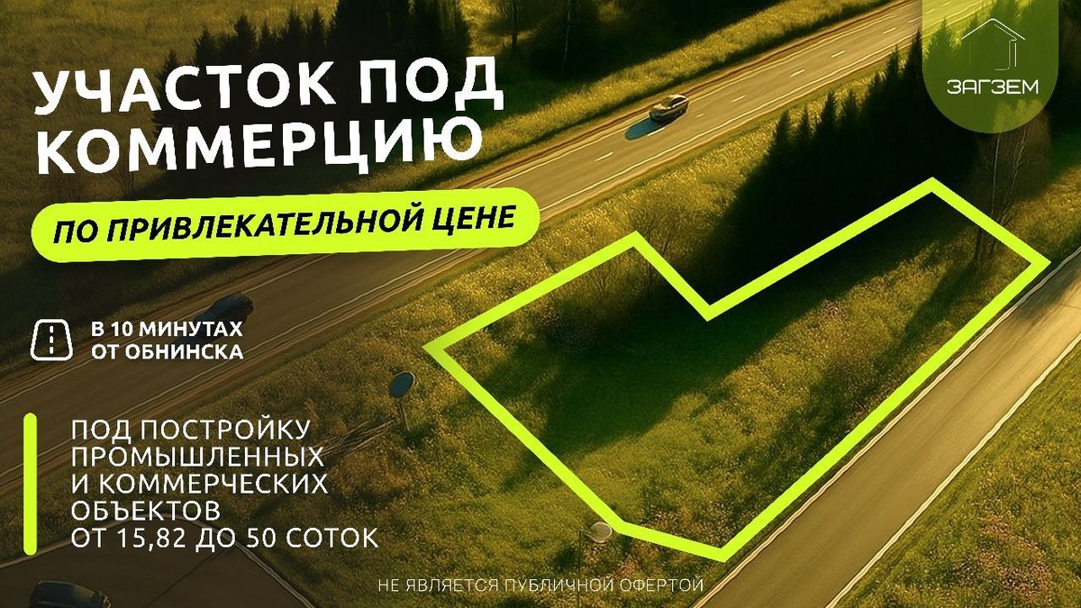 Готовая площадка для вашего бизнеса! Участок у Киевского шоссе, всего в 10 минутах от Обнинска. Идеально подходит под: - магазин - АЗС или автомойку - склад или офис - точку общепита ⚡ Подведены коммуникации: свет, газ по границе, дороги из асфальтовой крошки. ✅ Согласованный съезд с трассы от Росавтодора! 📏 От 15 соток с возможностью расширения до 50 соток. 💳 Покупка в вассрочку или ипотеку 🔥 Трафик, готовая инфраструктура и высокий потенциал роста! 👉 Забронируйте участок сейчас: https://zagzemforma.ru/poselki?utm_source=tg&utm_medium=cpc&utm_campaign=no ☎ +7 (920) 889-82-05 📩 @sales_zagzem Реклама. ИП Дымов П. И. ИНН 402573128005