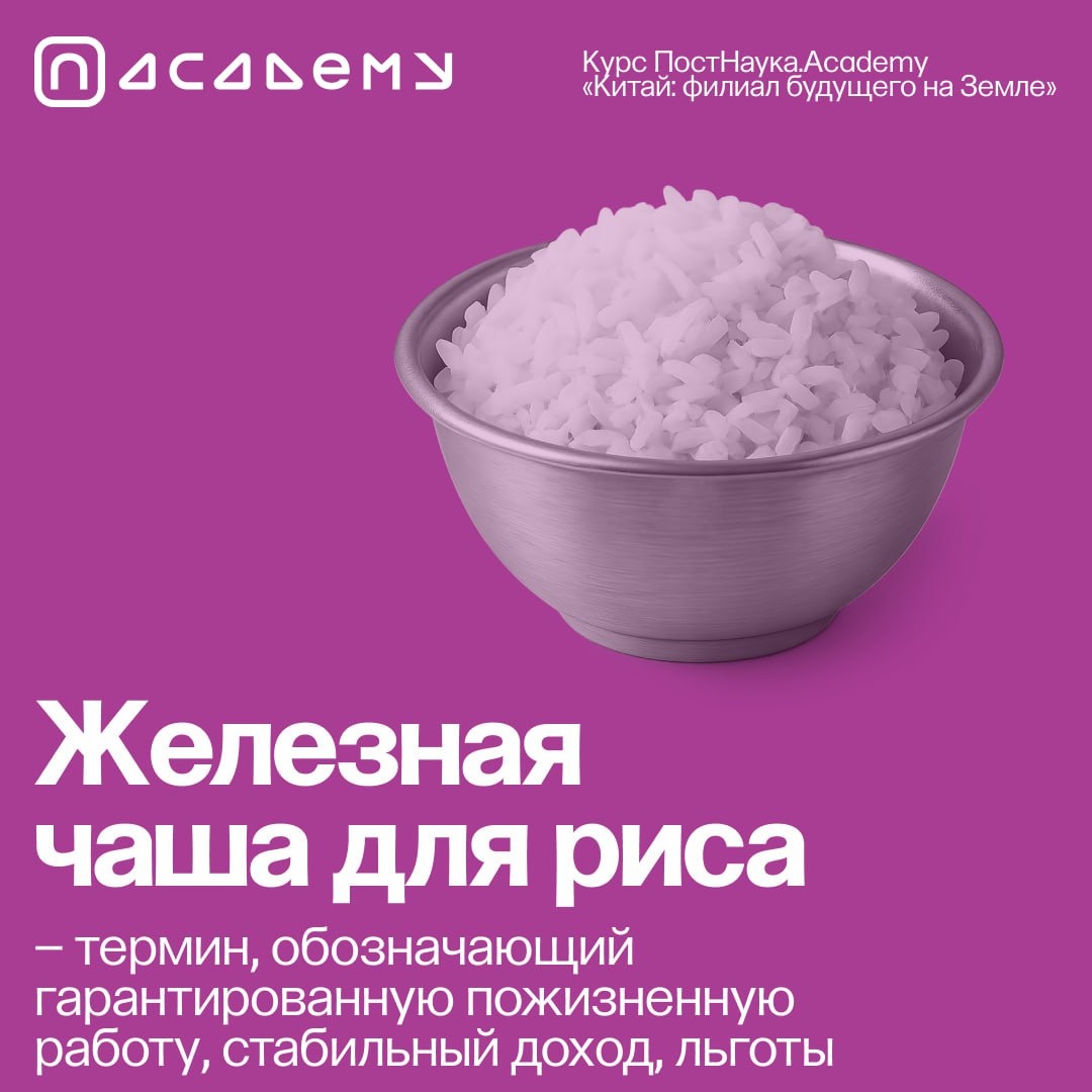 Термин китайский, но есть и английский эквивалент: «работа на всю жизнь». Обычно такой гарантией обладают военные, госслужащие, сотрудники государственных предприятий. «Железная чаша для риса» означает не просто стабильную работу, обеспечивающую такие же стабильные доход и благосостояние, а все эти блага – пожизненные. Есть два ключевых момента в «чаше» — гарантия входа и контроль выхода из работы. Как Китай стал Китайской Народной Республикой и почему Коммунистическая партия всё ещё у власти? Разбираем в одном из уроков курса Академии ПостНауки «Китай: "филиал будущего" на Земле». Посмотреть содержание и купить курс можно по ссылке: https://postnauka.org/link/china_tg