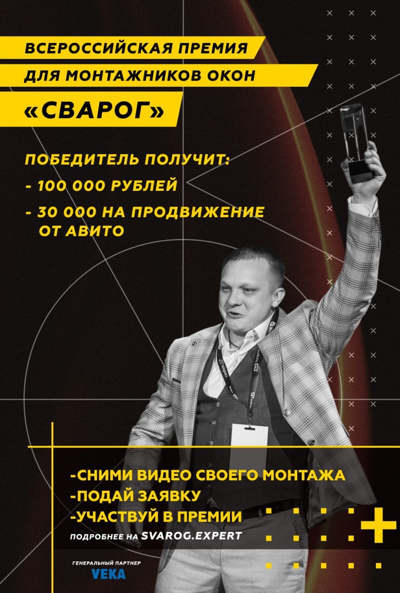 🔠🔠🔠🔠🔠🔠 Всероссийская премия «СВАРОГ» Шанс получить удар молнии — 1 к 300 000. Шанс выиграть в крупную лотерею — около 1 к 8 000 000. Шанс выиграть 100 000 ₽ в премии «СВАРОГ» — 1 к 100! 🚀Не пропусти свой шанс на победу и признание отрасли. Окончание приема заявок — 30 сентября. Выбирай свою номинацию и участвуй: 🥇Просто окно — для тех, кто доводит стандартное до совершенства. 🥇Крупногабарит и порталы — для покорителей масштабов и сложных форм. 🥇 Алюминиевые дверные блоки — для экспертов по современным и надежным решениям. 🥇 Мастер-наставник — для тех, кто растит новое поколение профи. 🥇 Популяризатор профессии — для тех, кто с гордостью рассказывает о нашем деле. 🔹 Генеральный партнёр — VEKA Rus. Все подробности и подача заявок — на официальном сайте: svarog.expert